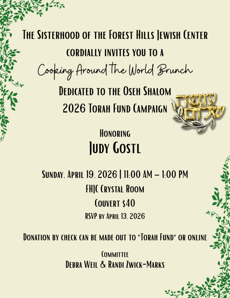 Sisterhood Torah Fund: Sunday, April 19th at 11:00 AM