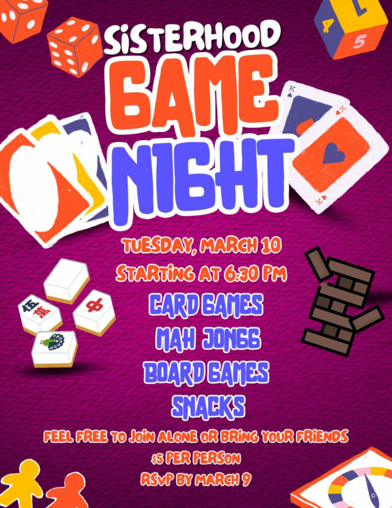 Sisterhood Game Night: Tuesday, March 10th at 6:30 PM